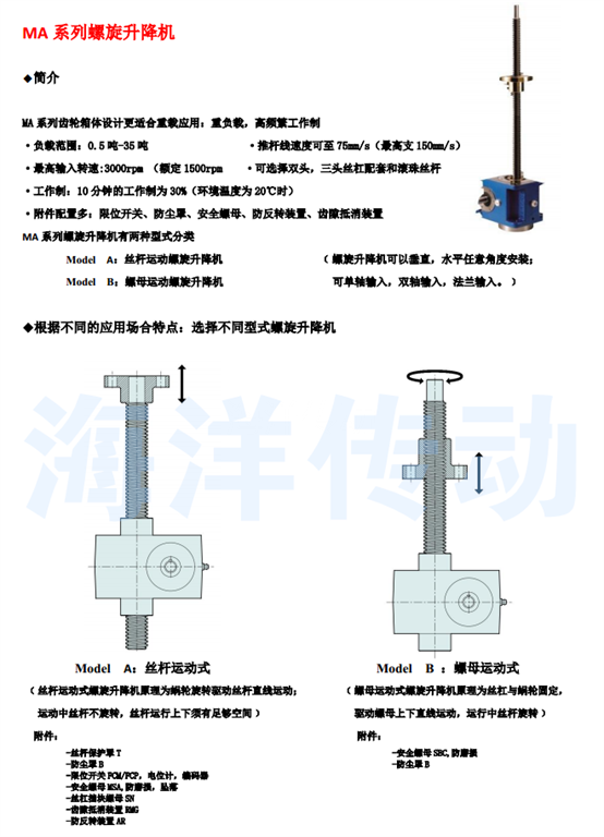 MA系列普通齒螺旋升降機 更適合重載應用:重負荷,高頻繁工作制 額定負載: 0.5噸 -35噸 推桿升降速度可至75mm/s 高輸入轉速: 3000rpm 工作制:30%(10分鐘運行3分鐘) 可選擇雙頭,三頭絲杠配套,參數咨詢我公司 附件:齒隙抵消裝置,防轉轉置,安全螺母,防塵罩,磁感應限位開關