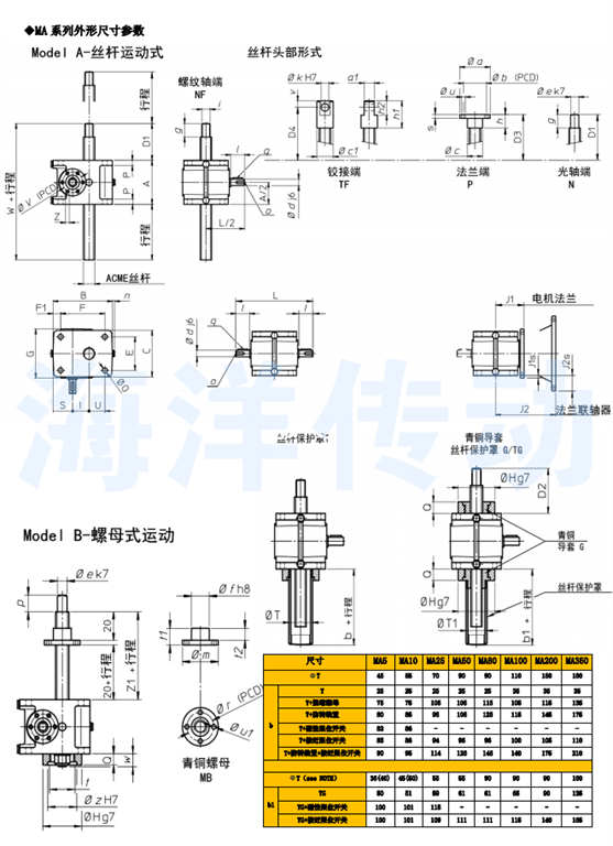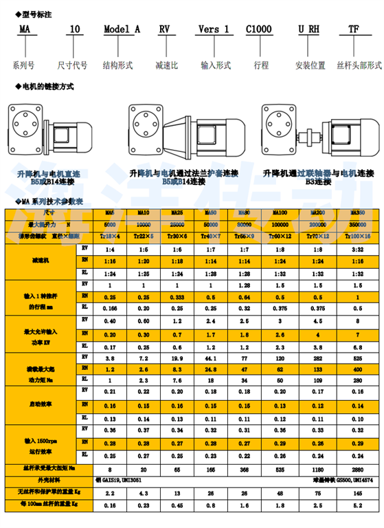的設計,緊湊的鋁齒輪箱體,與 MA系列有低的價格額定負載: 0.5噸 - 20噸 推桿升降速度可至30mm/s 高輸入轉速:1500rpm 工作制:20%(10分鐘運行2分鐘)可選擇雙頭,三頭絲杠配套,參數咨詢我公司附件:齒隙抵消裝置,防轉轉置,安全螺母,防塵罩,磁感應限位開關 MA系列普通齒螺旋升降機 更適合重載應用:重負荷,高頻繁工作制 額定負載: 0.5噸 -35噸 推桿升降速度可至75mm/s 高輸入轉速: 3000rpm 工作制:30%(10分鐘運行3分鐘)