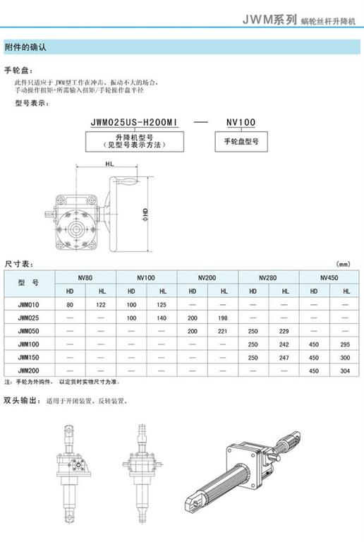 JWM絲桿升降機(jī)附件的確認(rèn)-手輪盤(pán)、尺寸表及雙頭輸出